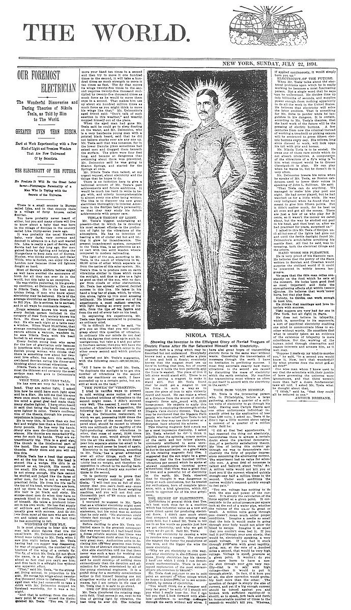 Before deciding to give Mr. Tesla unlimited space in the greatest newspaper that was ever heard of, I had heard from a dozen reliable sources that there was not the slightest doubt about his being a very great man. Authorities unite in declaring him the very greatest man living in the line of abstract electrical research.