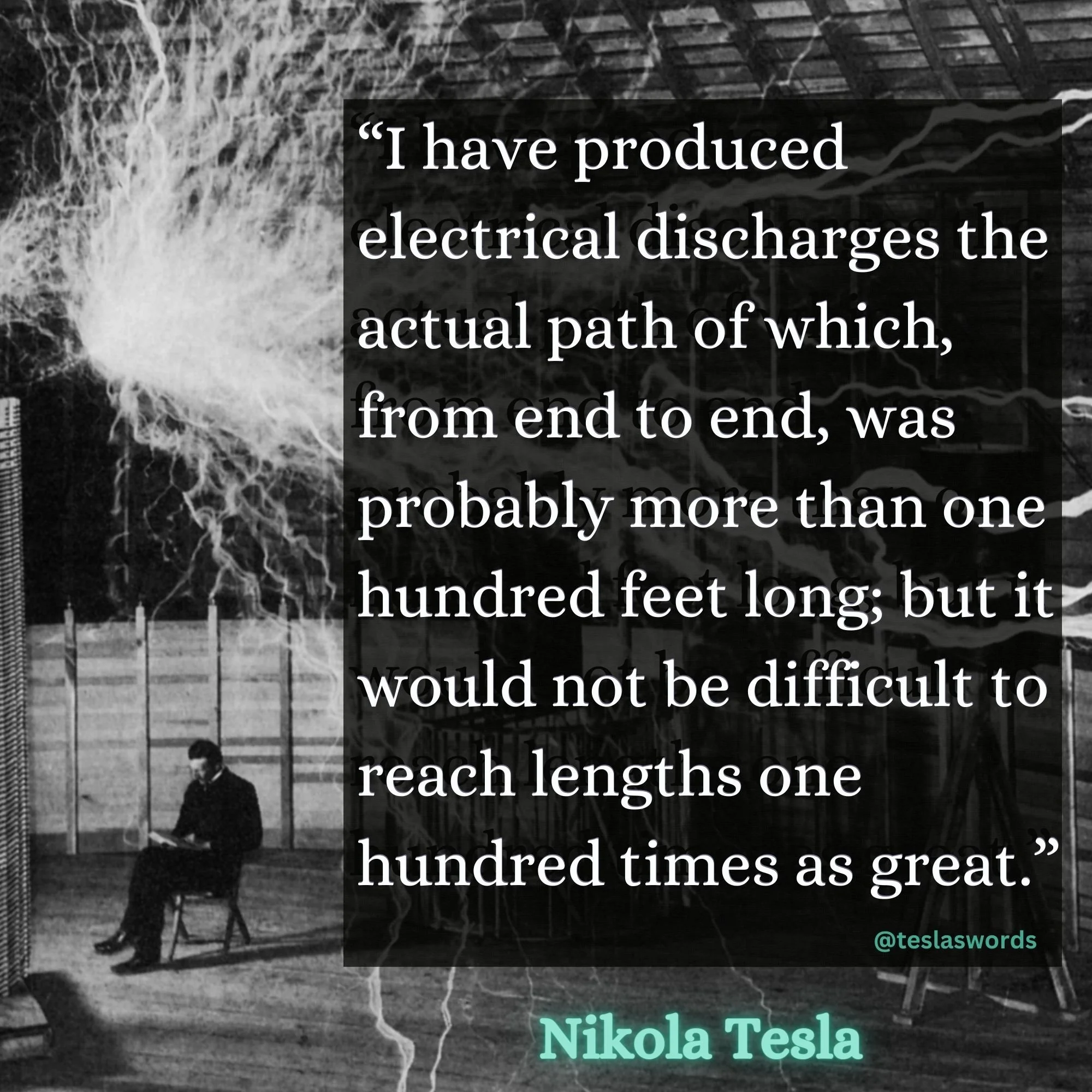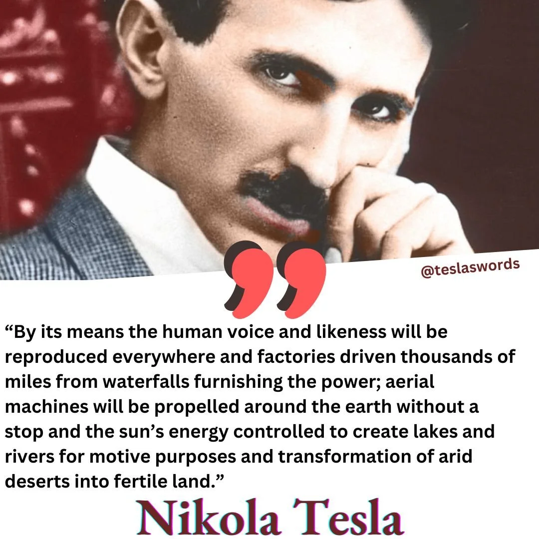 “If we could produce electric effects of the required quality, this whole planet and the conditions of existence on it could be transformed. The sun raises the water of the oceans and winds drive it to distant regions where it remains in a state of most delicate balance. If it were in our power to upset it when and wherever desired, this mighty life-sustaining stream could be at will controlled. We could irrigate arid deserts, create lakes and rivers and provide motive power in unlimited amounts. This would be the most efficient way of harnessing the sun to the uses of man. The consummation depended on our ability to develop electric forces of the order of those in nature.”