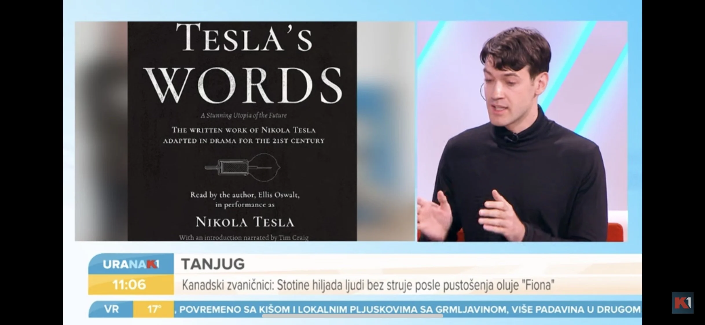 The young American author traveled to Serbia to speak about the visions that plagued Tesla for his entire life, and the new book, Tesla’s Words. A few days before, he said something similar on live television for K1 Morning: